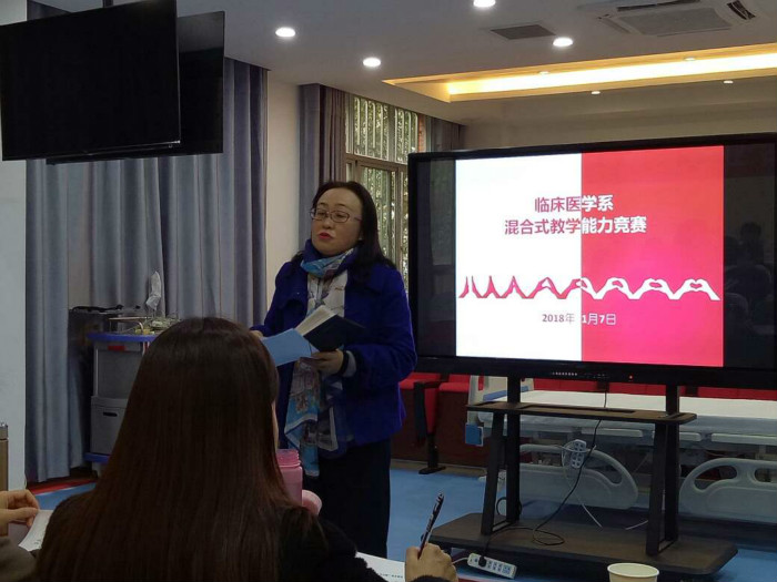 这是我系首次组织混合式课堂教学比赛,研究制订了《临床医学系2018~2019学年第一学期混合式课堂教学比赛方案》,要求全系教师人人参与。比赛分为初赛和决赛两个阶段,初赛由教研室、实训室组织,赛后须提交全体教师比赛视频,并根据名额推荐参加决赛教师。决赛过程精彩纷呈,进入决赛的七名教师充分利用学习通、蓝墨云班课等平台,创新课堂设计,将线上、线下教学有机结合起来,引导学生自主学习、大胆陈述、勇于思辨。整个赛事呈现出突破传统、拓展创新的精神面貌。最终邱晓梅老师获得一等奖,王运贤、唐冰老师获得二等奖,陈喜苹等四位老师获得三等奖。