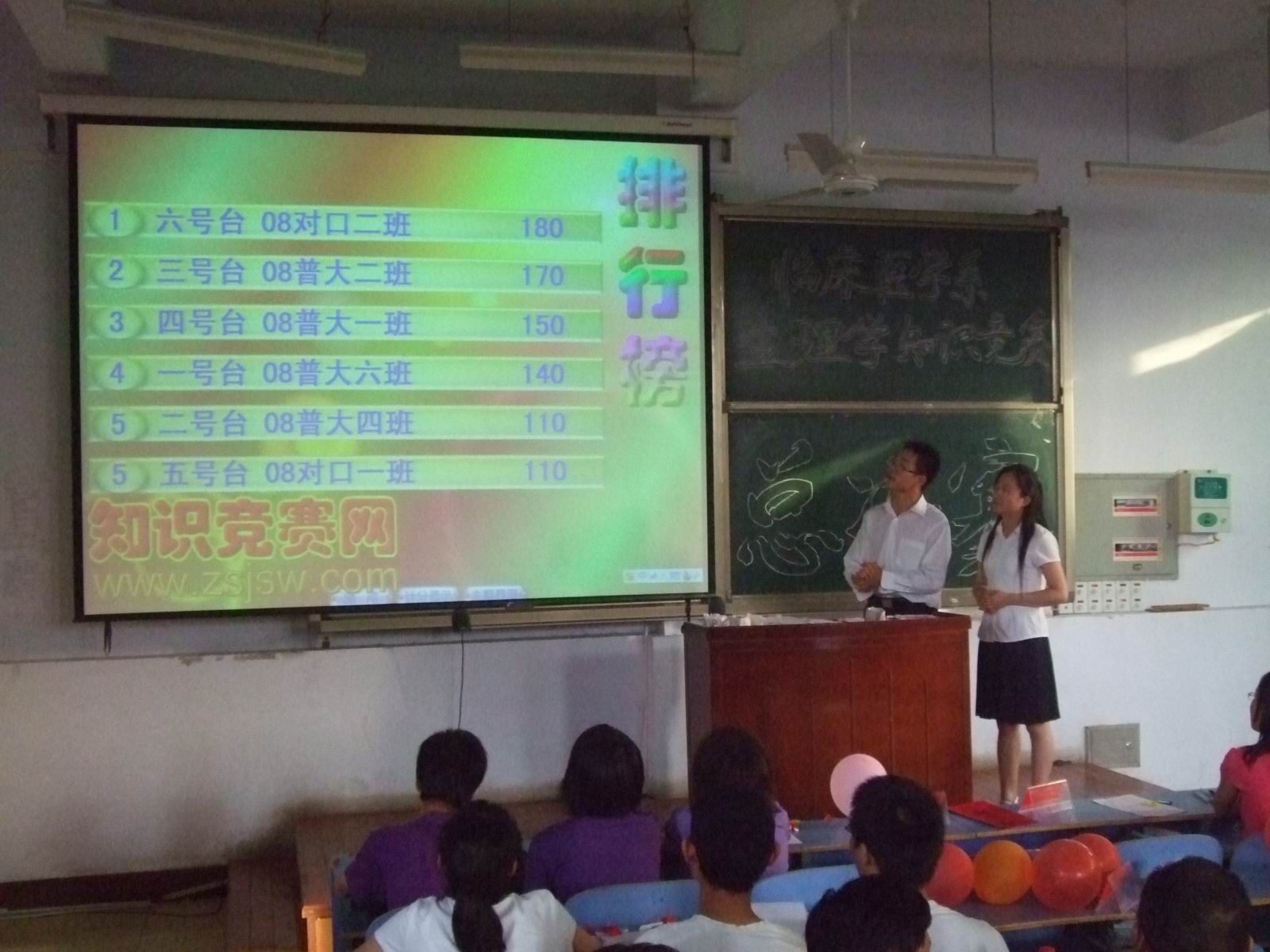 决赛共分必答、抢答、风险提速三个环节。参加比赛的六个代表队18名选手是此前经初赛、复赛后脱颖而出的优秀代表,个个沉着冷静,信心十足。比赛中选手答题准确,各队得分竞相攀升,角逐异常激烈,现场掌声不断。三个环节全部赛完时,分数最高的两个班得分相同,在加试题目后08普大对口2班最终以10分优势取得冠军,08普大临床2班屈居亚军。