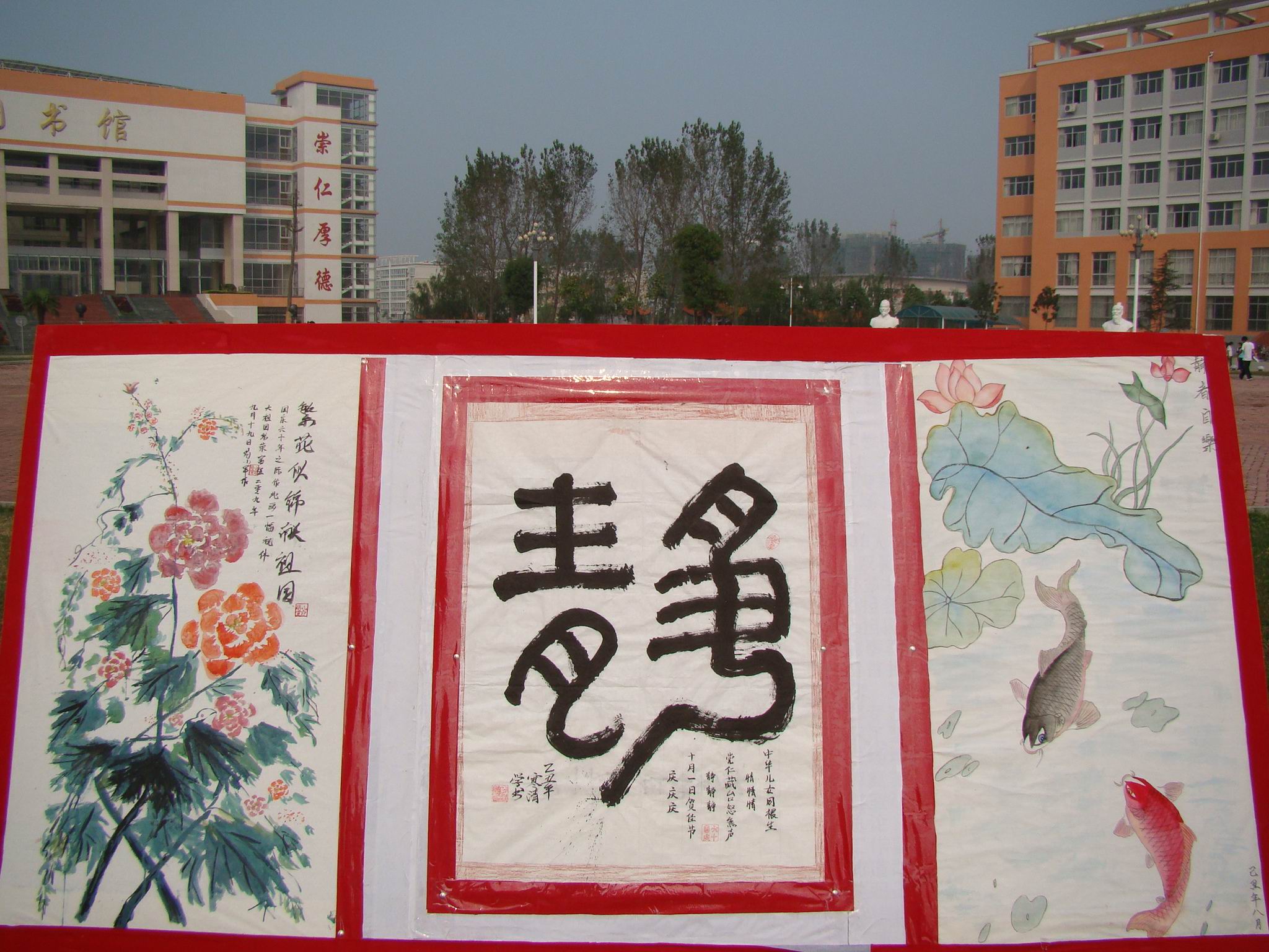 在祖国60华诞来临之际,9月28日,我校临床医学系团总支举办的“迎新生庆国庆书画展”在主校区图书馆前广场上隆重展出。