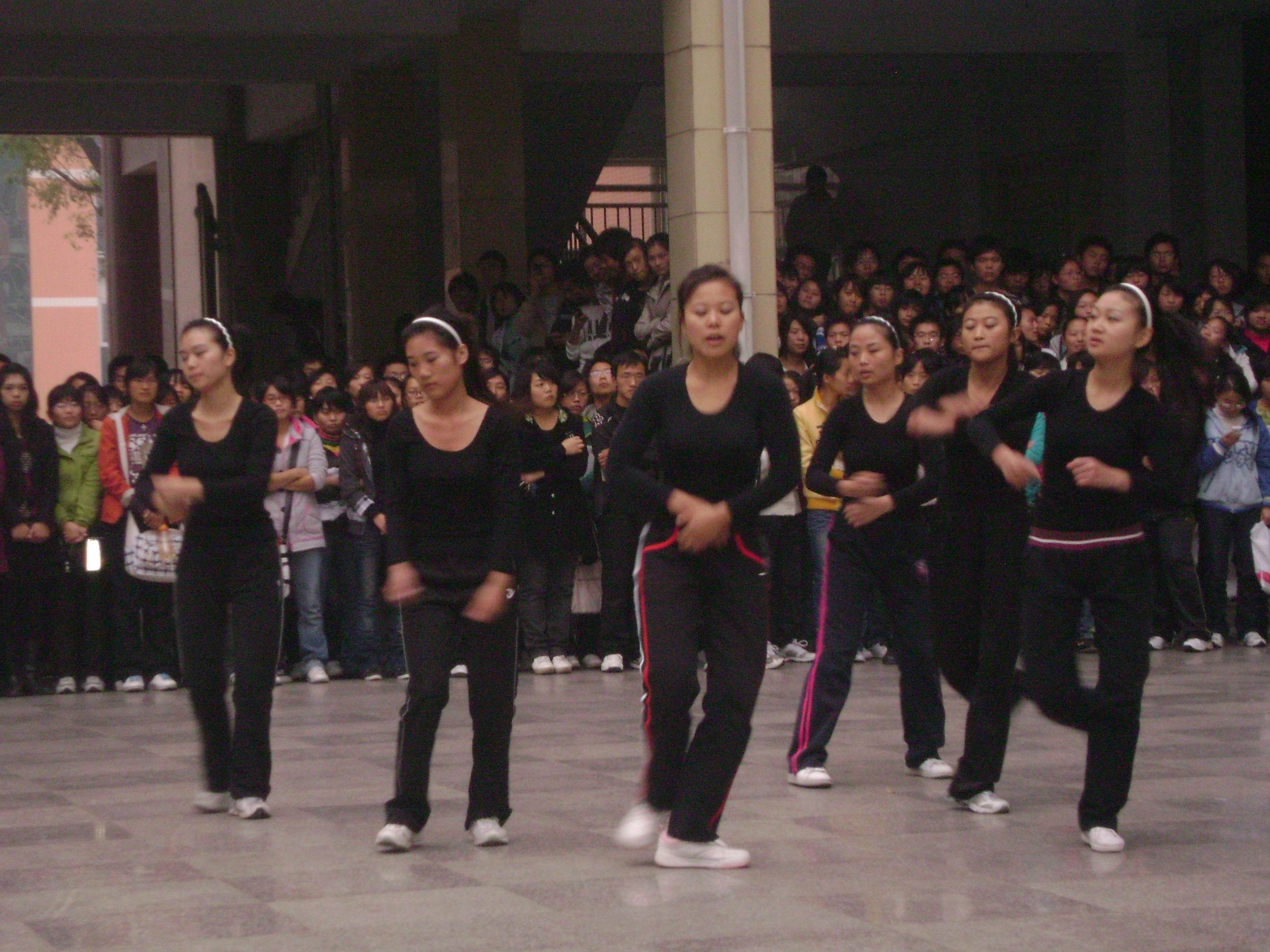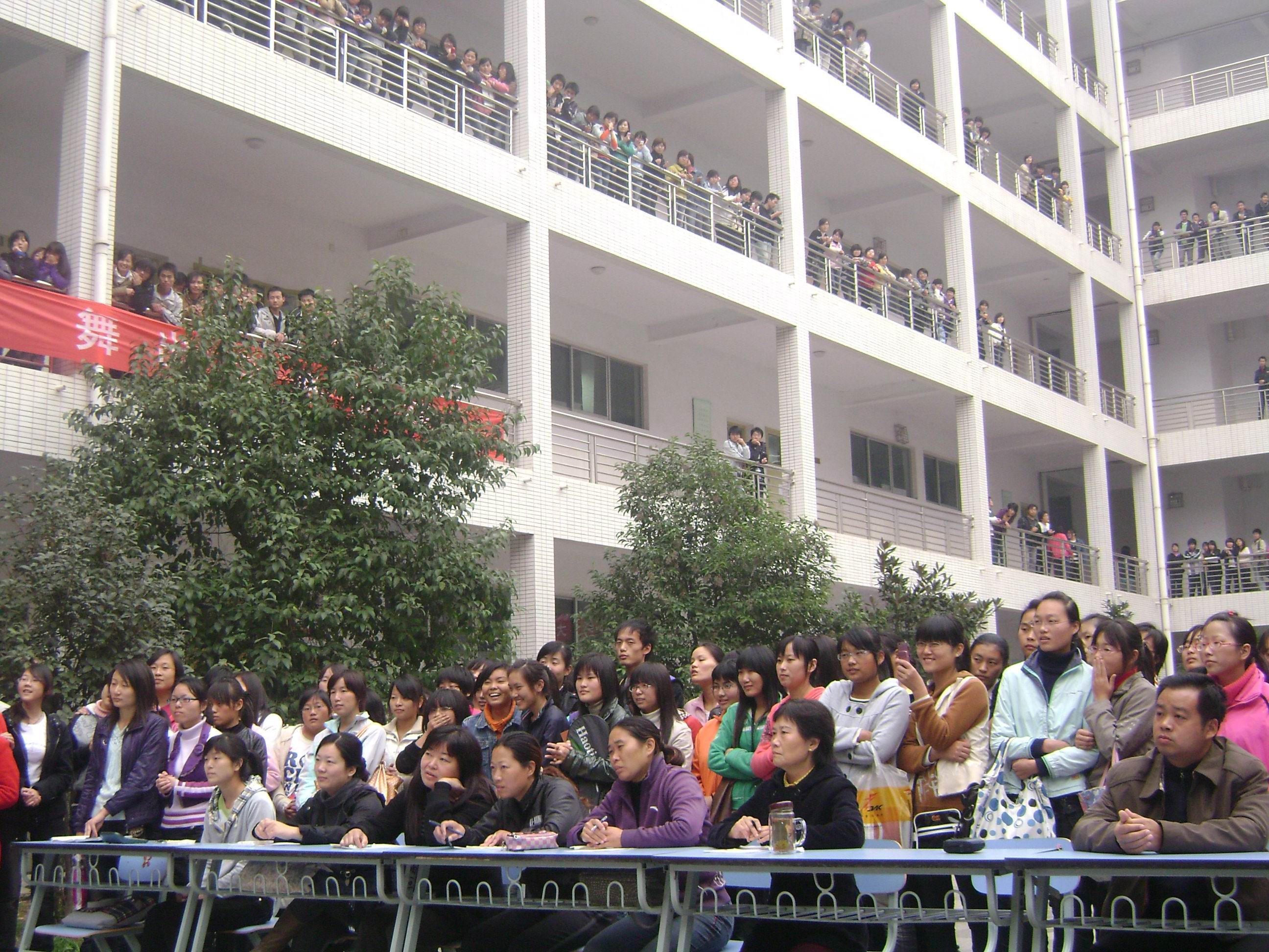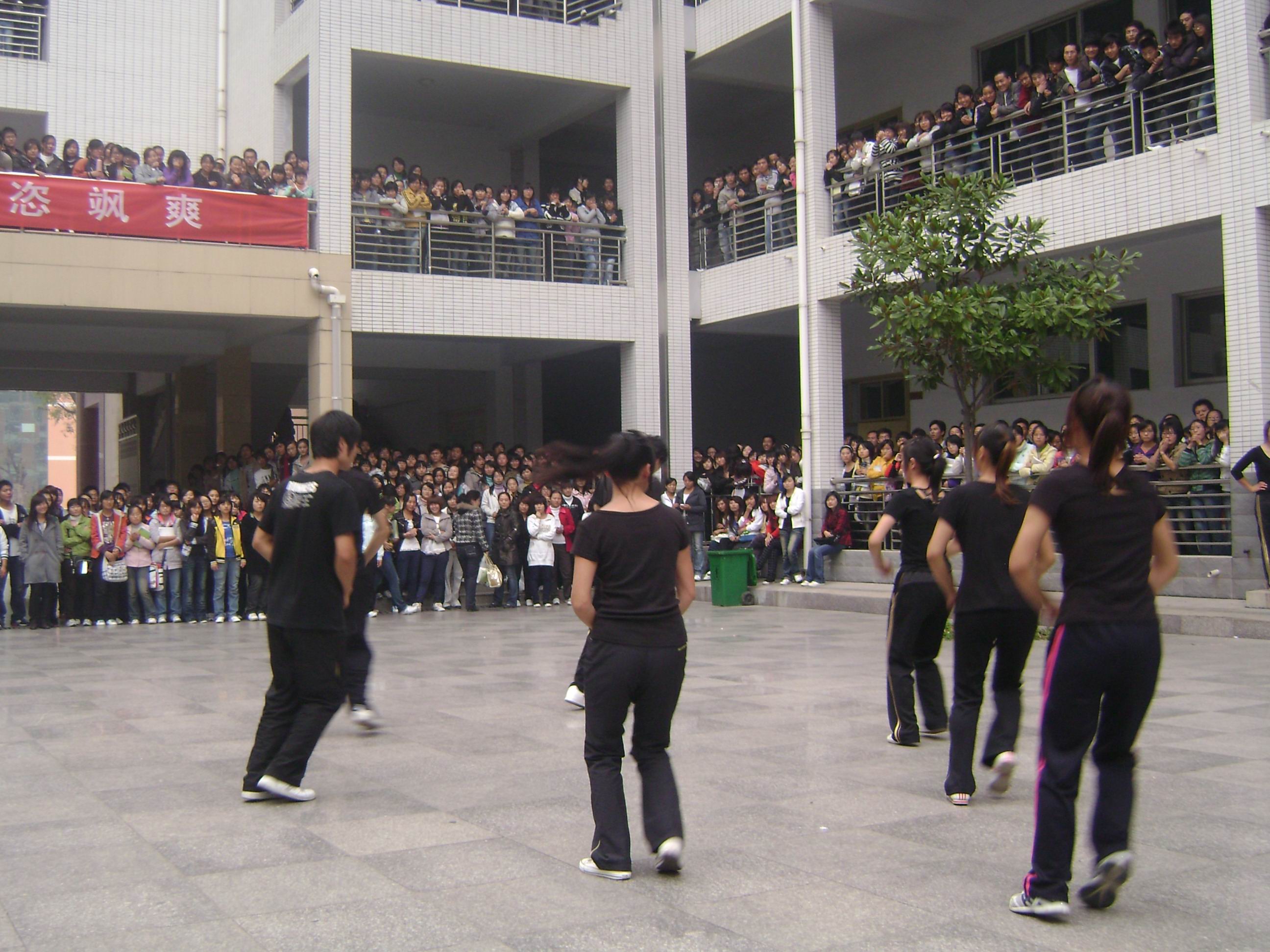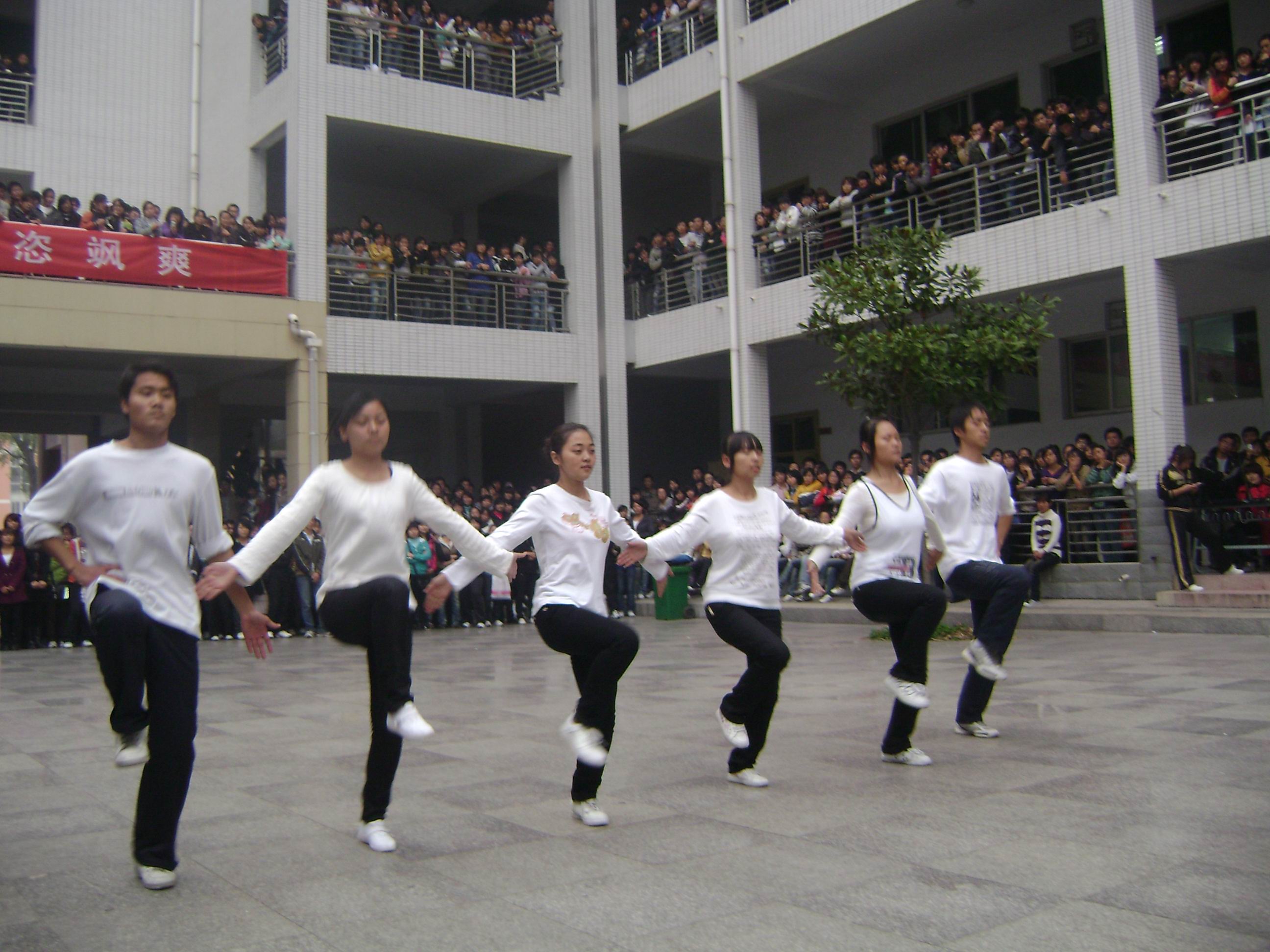 周五下午4:30,主校区1号教学楼院内人声鼎沸、乐声强劲、气氛热烈。从初选中脱颖而出的18支各班代表队参加了比赛。体教部余丽霞、罗文娜老师、团委古婵老师应邀和我系党总支书记宋新及辅导员仵湘君一起担任现场评委。