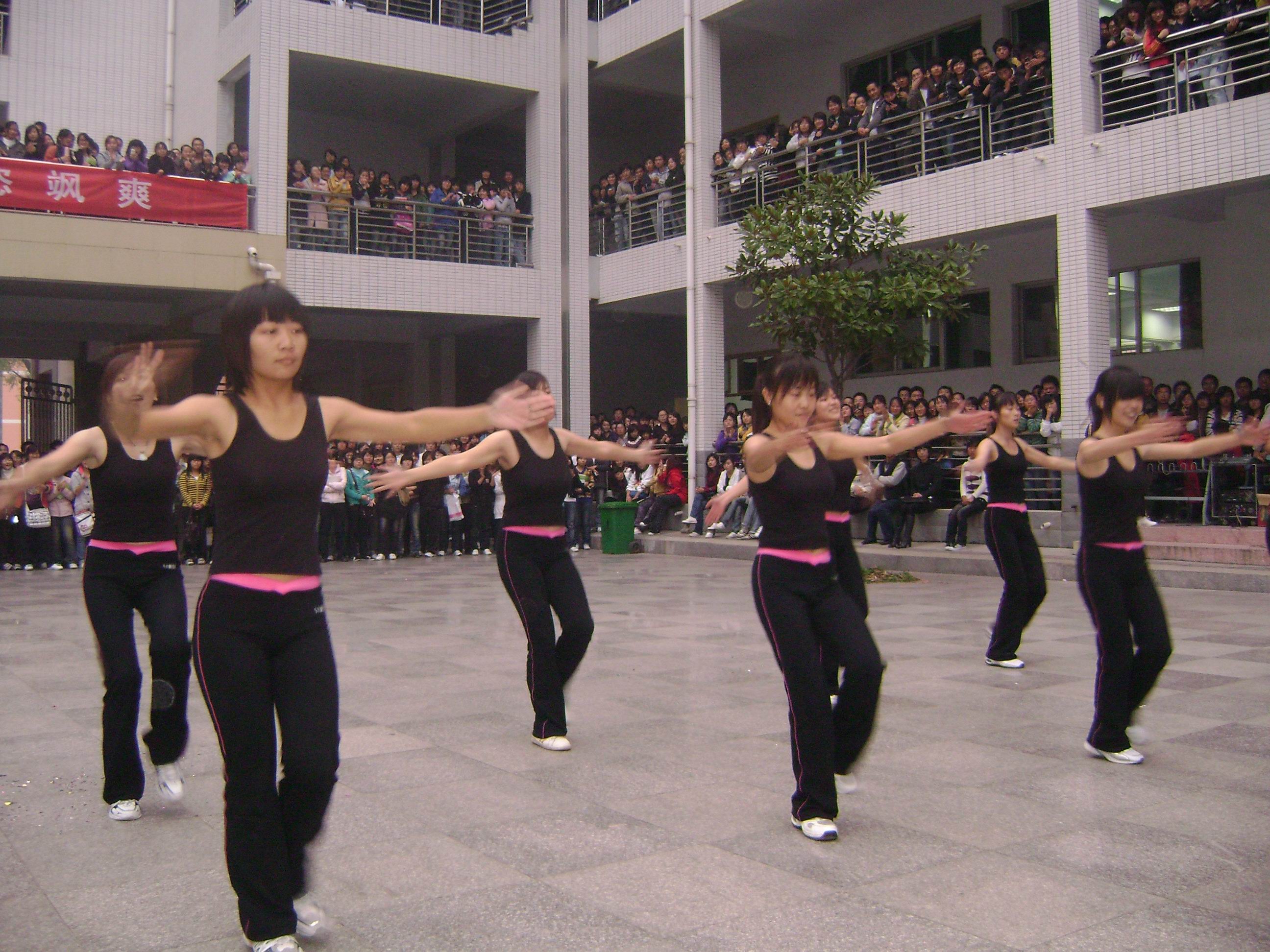 比赛时适逢下午放学,楼下空地上,五层教学楼的走廊上到处是观看比赛的同学,整个一号教学楼成了一个天然剧院。各参赛队艳丽的服装、舒展的身姿、抖擞的精神,一上场就赢得了热烈的掌声。各参赛队巧妙的编排、优美的动作,动感的音乐、加上整齐连贯的动作带来了陈陈嘹亮的加油喝彩声。整个教学楼到处飘荡着运动的旋律、青春的气息、热烈的笑脸。最后09普大临床4班代表队荣获第一。