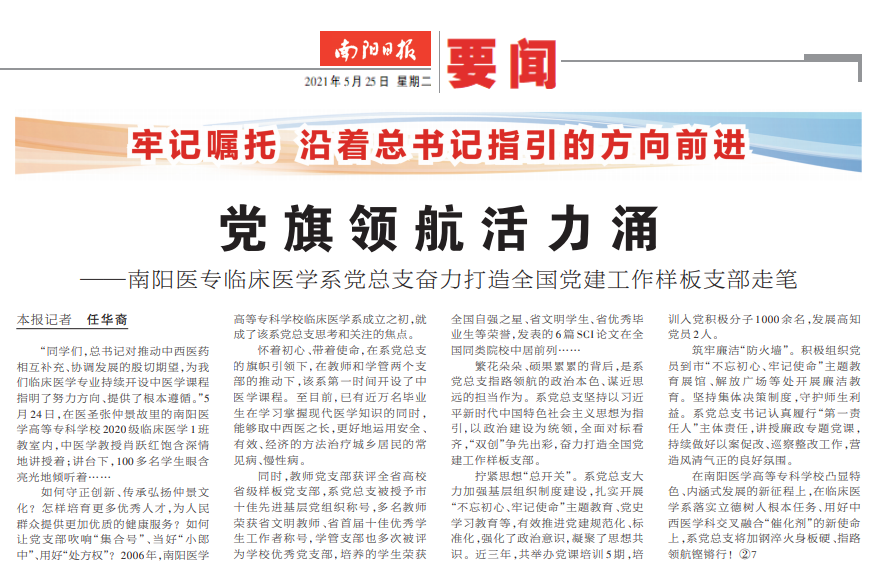2021年5月25日出版的《南阳日报》以《党 旗 领 航 活 力 涌 ——南阳医专临床医学系党总支奋力打造全国党建工作样板支部走笔》为题对我系党建工作进行了报道。