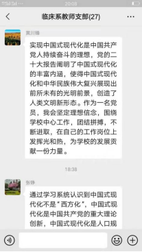 报告结束后,师生党员热切交流学习体会。教师党员黄金珠说,“何老师关于中国式现代化的讲解非常清晰透彻,让我们了解到中国式现代化的发展历程、特征和要求,这对教育者来说非常重要,只有老师们深刻理解了中国式现代化的内容和内涵,才能与课程、课堂相结合,做好课程思政。”
