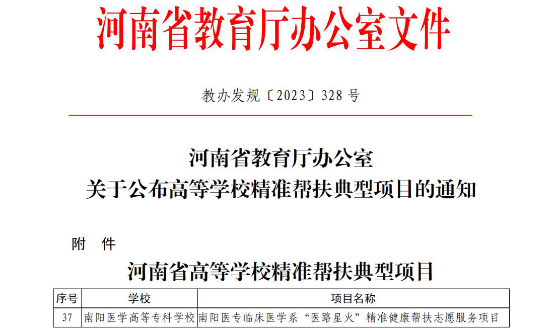 近日,河南省教育厅办公室公布入选高等学校精准帮扶典型项目名单,全省共推选出 40 个典型项目。南阳医专临床医学系“医路星火”精准健康帮扶志愿服务项目入选。