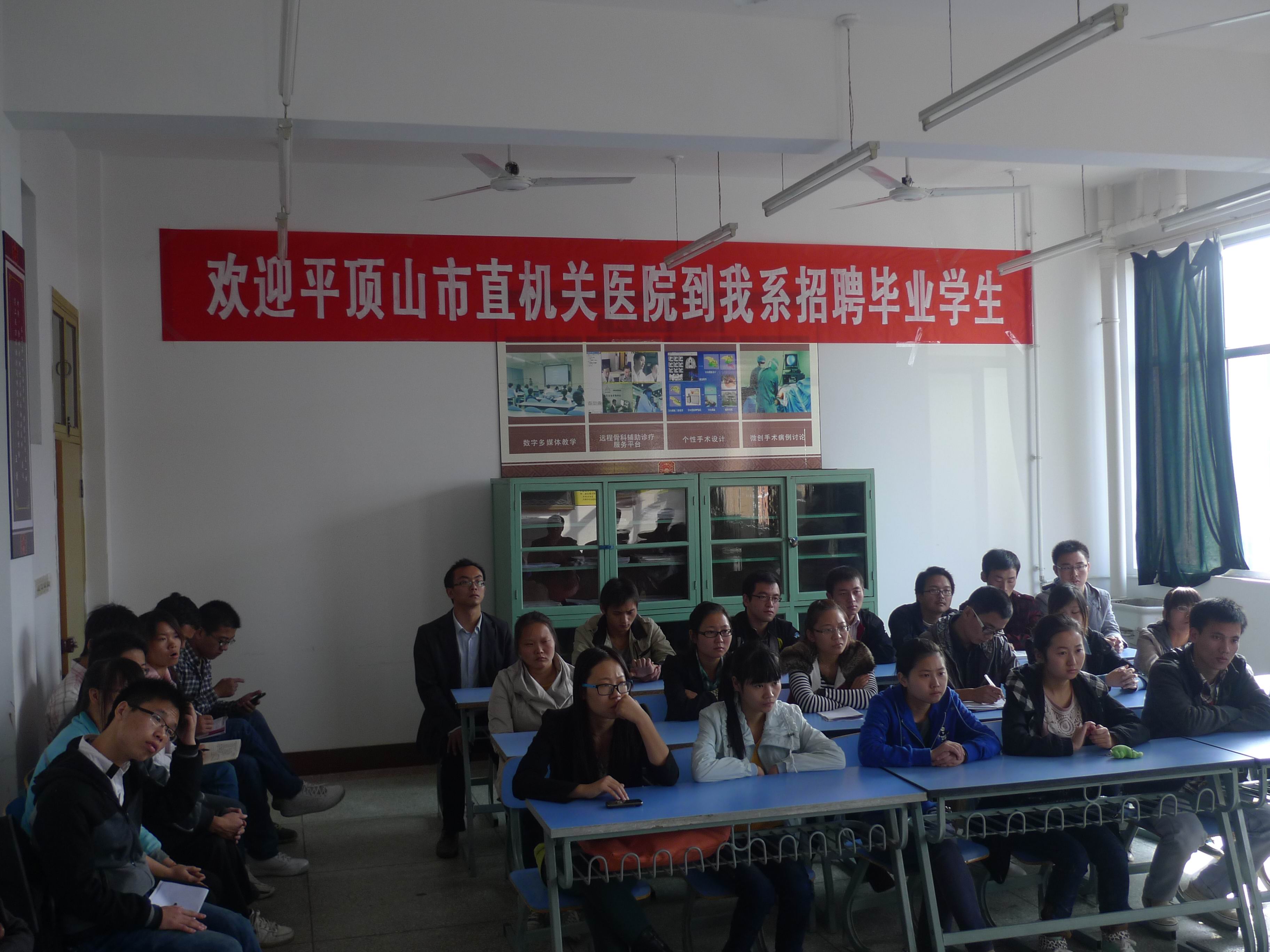 2012年10月25日,平顶山市直机关医院来我校招聘毕业学生。临床医学专业和针灸推拿专业二十多名毕业生参加了应聘。在招聘会上,医院领导介绍了医院的基本情况及对应聘学生的要求,更是着重宣讲了医院浓厚的学习氛围及医院的发展潜力。